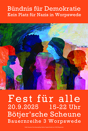 Das wollen wir feiern am 20.09.2025 von 15 bis 22.00 Uhr in der Boetjer’schen Scheune. Am 20.09.2025 beteiligen wir uns als Teil des Bündnisses für Demokratie- Kein Platz für Nazis in Worpswede an einem Fest für Demokratie in der Bötjer’schen Scheune.