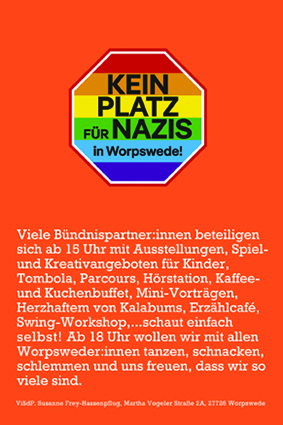 Vor ungefähr eineinhalb Jahren schlossen sich 45 Gruppierungen und Institutionen zusammen, um zu signalisieren, dass eine große Mehrheit der worpsweder Bürger:innen nicht bereit ist, rechtes Gedankengut, Hass und Hetze hier im Ort zu tolerieren oder gar Raum zu geben.